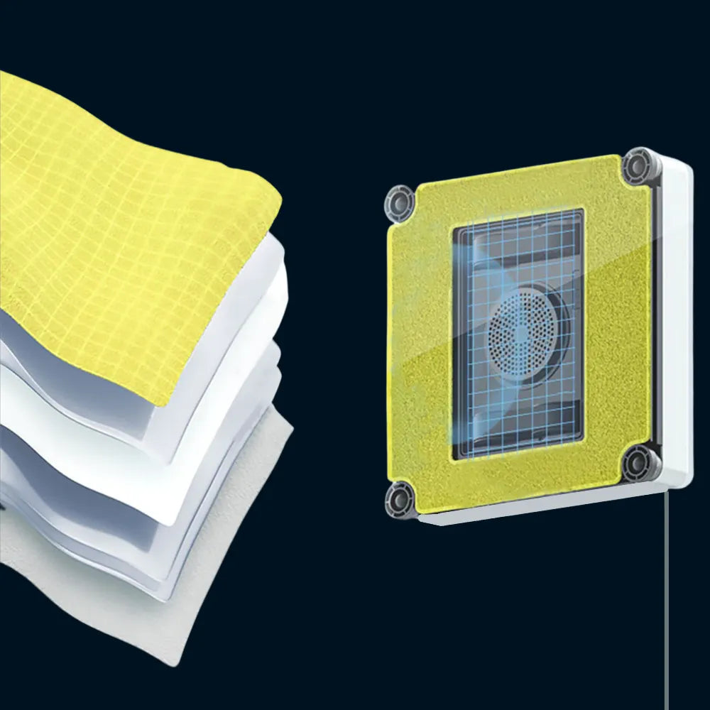 Rengöringsduken fångar effektivt damm, smuts och kan även rengöra ytan längs kanterna. Smutsiga mikrofiberdukar kan enkelt tas bort och tvättas i tvättmaskin på 60 grader. På botten av roboten finns luftkuddar som automatiskt anpassar sig till den yta som skall rengöras. Tack vare detta rör sig enheten tillförlitligt och smidigt längs glaset.