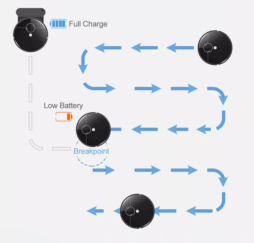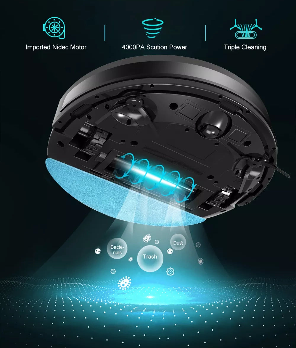 The robot vacuum cleaner efficiently collects dust, crumbs, gravel and debris, thanks to a strong suction power that together with the double side brushes and the main brush.
