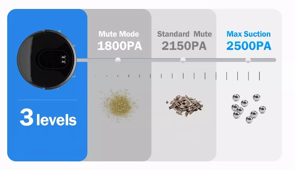 With a powerful suction effect, the robot sucks up dust, hair, crumbs, gravel, pebbles. The suction force is adjustable and you can choose three different positions based on the cleaning situation.