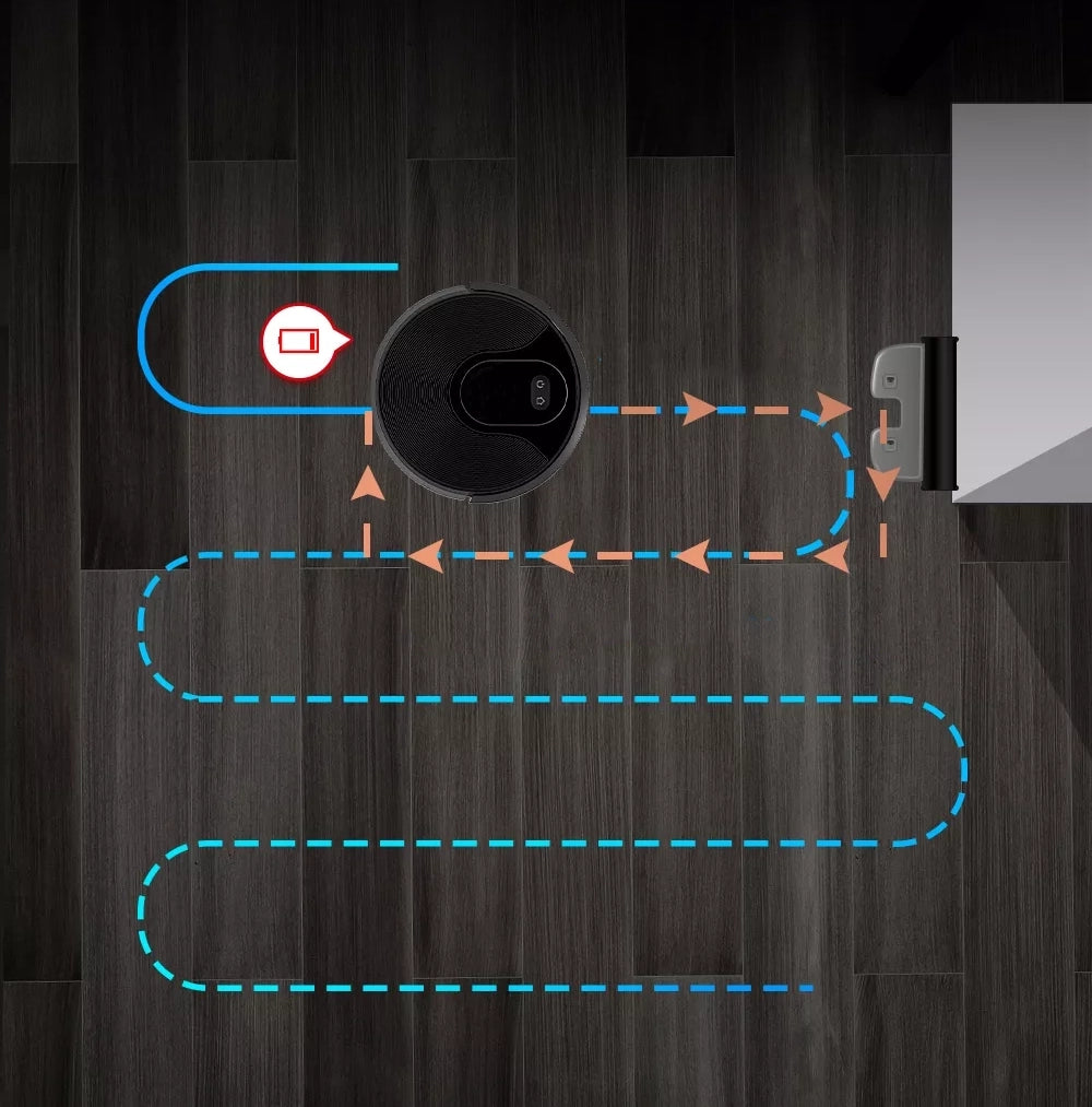 The robot returns to the charging station when the battery needs to be charged. Once it has uploaded the battery, it continues to work where the completed work last.