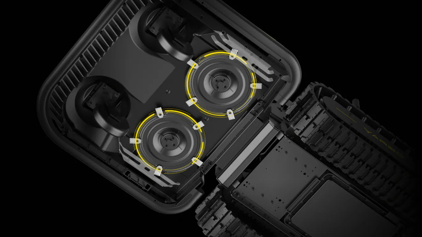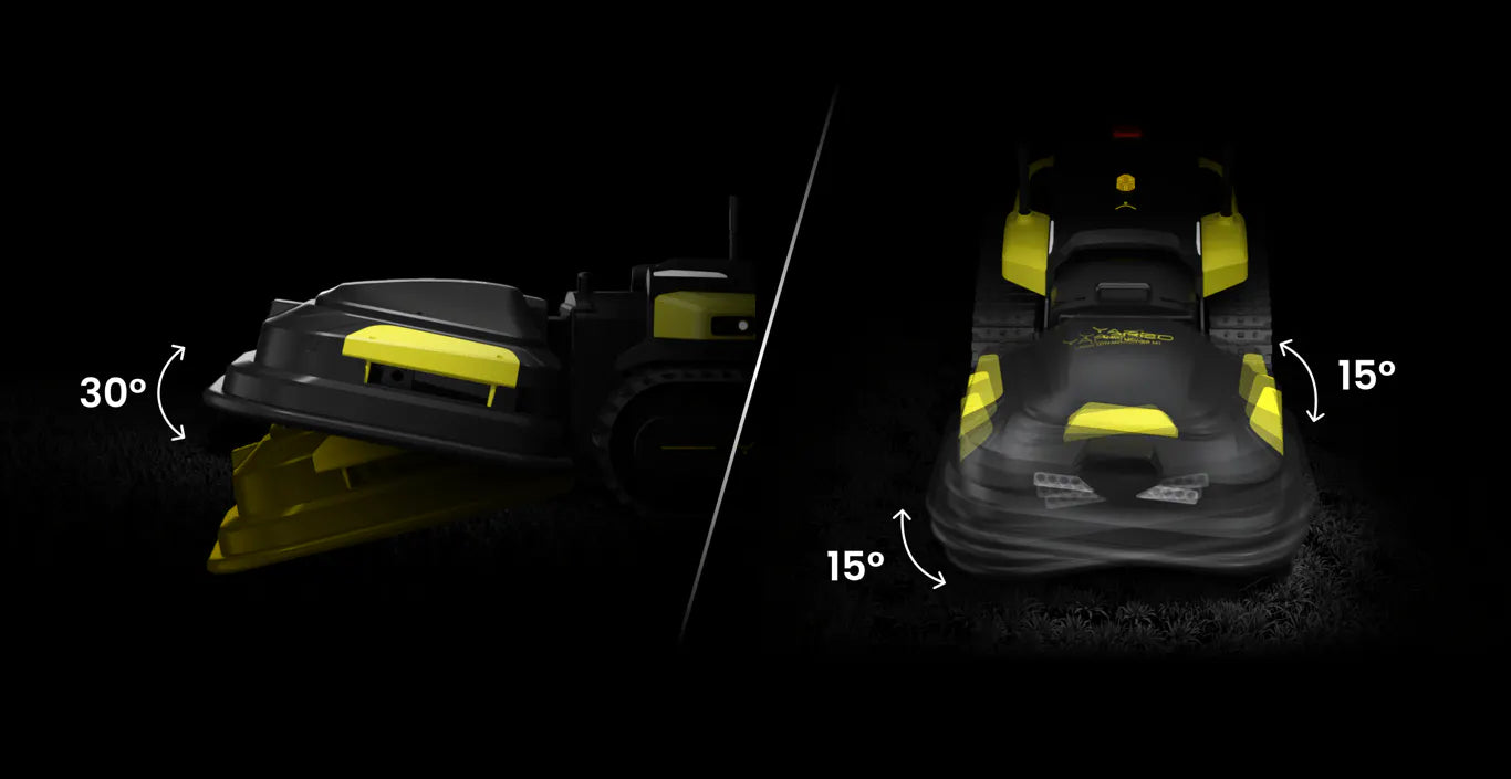 Yarbo är konstruerad för att mästerligt hantera sluttningar så branta som 35 grader (en lutning på upp till 70 %), dess innovativa gummibandssystem säkerställer inte bara en varsam beröring av gräset för att förhindra skador, utan ger också den stabilitet som behövs för att förhindra glidning. Dessutom gör den flexibla designen att den smidigt kan ta sig förbi vanliga hinder i trädgården som stentrappor eller grenar som är upp till 2 tum höga.