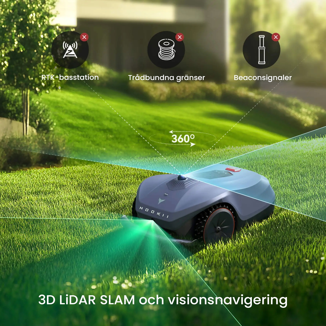 Neomow X-serien använder 3D LiDAR SLAM och visuell fusion för att täcka hela gräsmattan, smidig hinderundvikning och perfekt klippning varje gång.