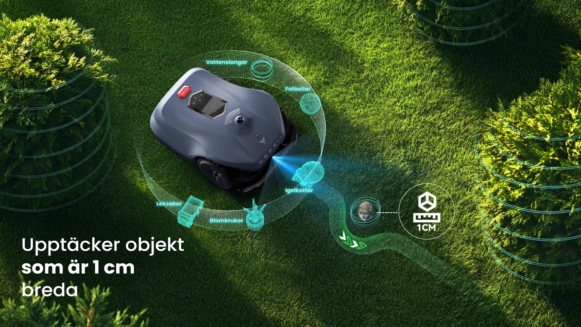 Upptäcker hinder så små som 1 cm breda och 15 cm höga – skyddar både din gräsmatta och gräsklippare med precision.